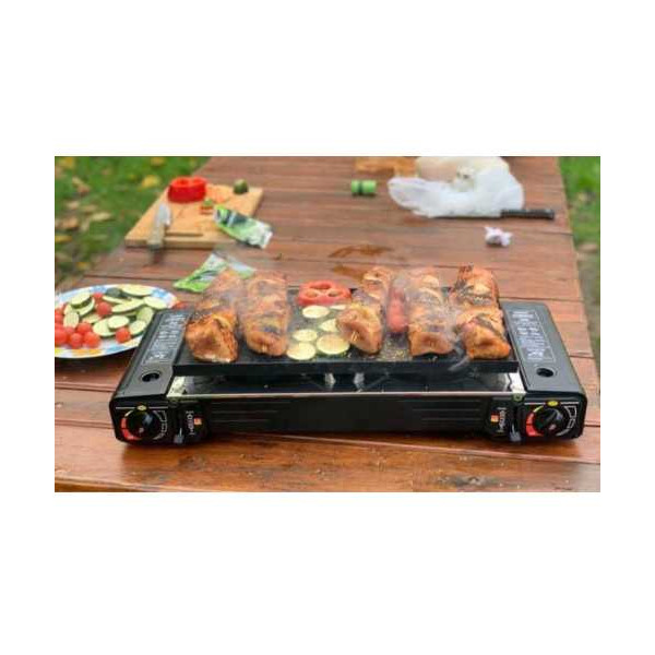 Plynový vařič dvouplotýnkový s grilovací deskou + 12 kartuší